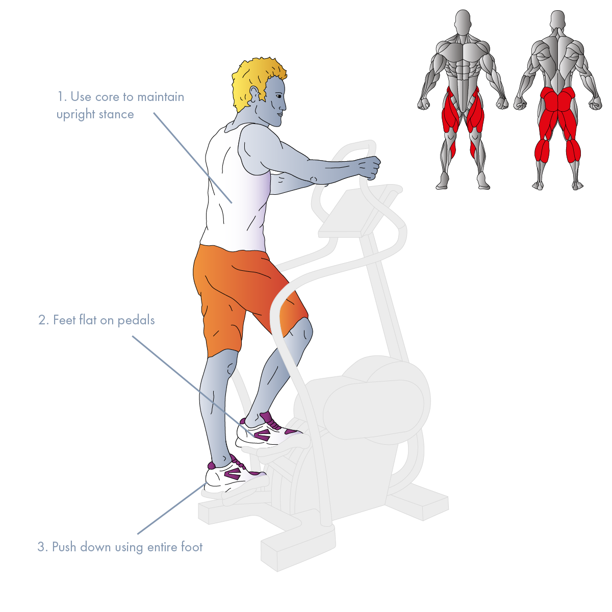 - FOOT PLACEMENT: Each foot should be placed flat on the step pedal to help maintain balance. Also, minimize how far your knees travel forward past your toes to reduce the stress placed on your joints.